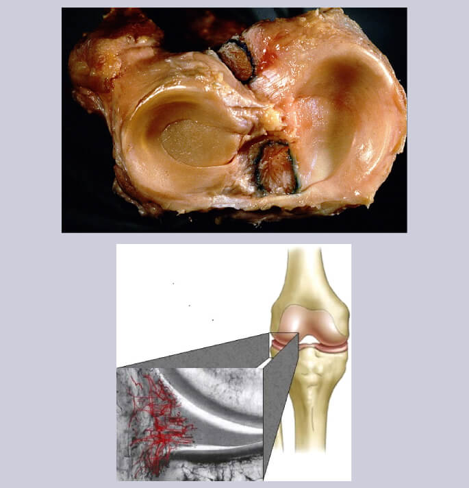 Tussen het onderbeen en het bovenbeen liggen zowel aan de binnen- en als aan de buitenzijde een elastische schokbreker (meniscus) bestaande uit fibrocartilago)